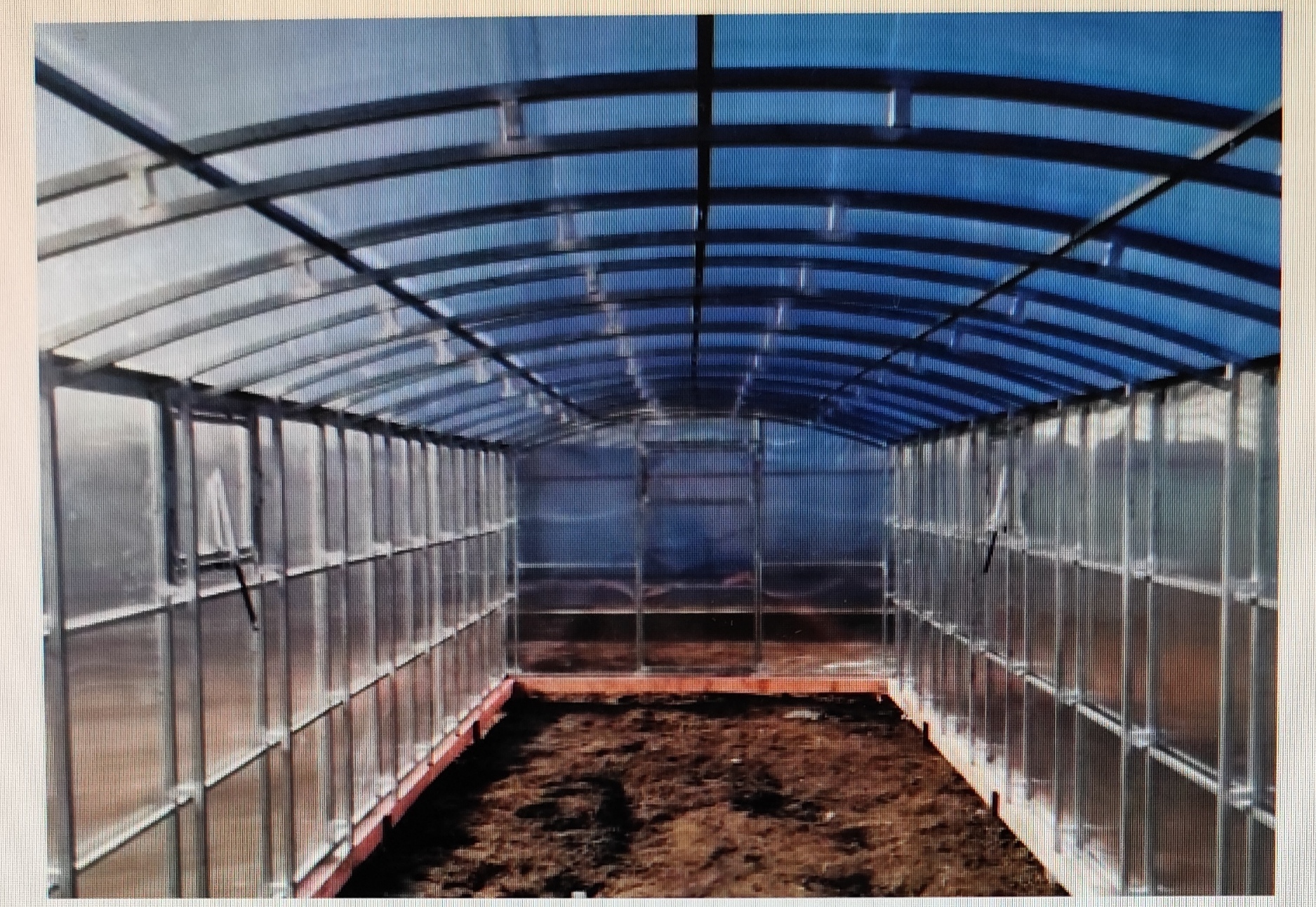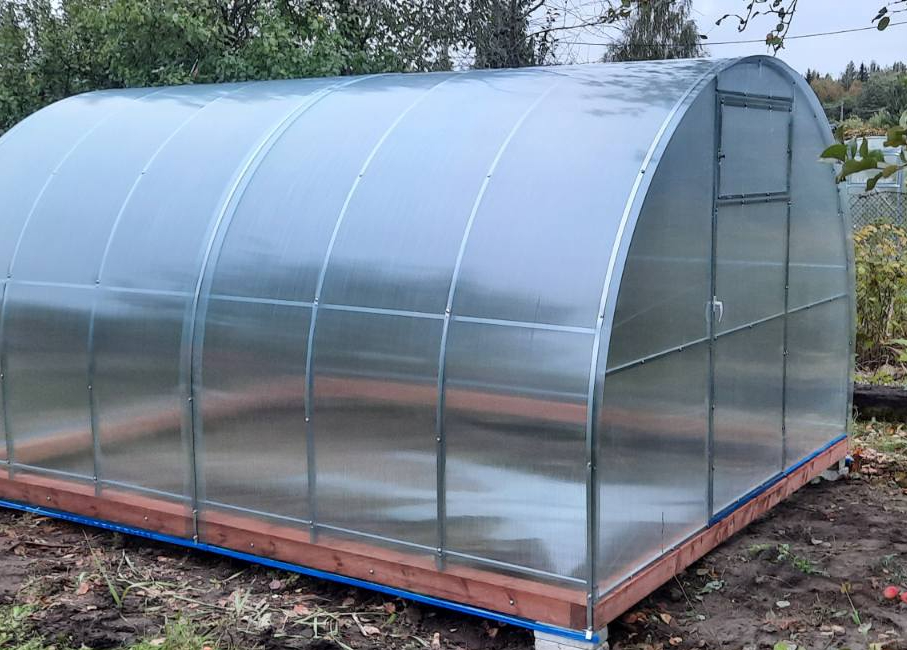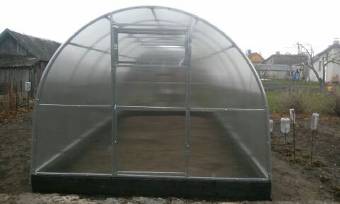 Арочная рама из оцинкованных стальных труб .Торцевые стенки- сварные; арки не разборные. Дверь на обоих концах с окном для проветривания, поликарбонат 4мм. В комплекте все необходимые для сборки болты и саморезы Теплица устанавливается на грунт ,фундамент или брус (не входит в комплект
