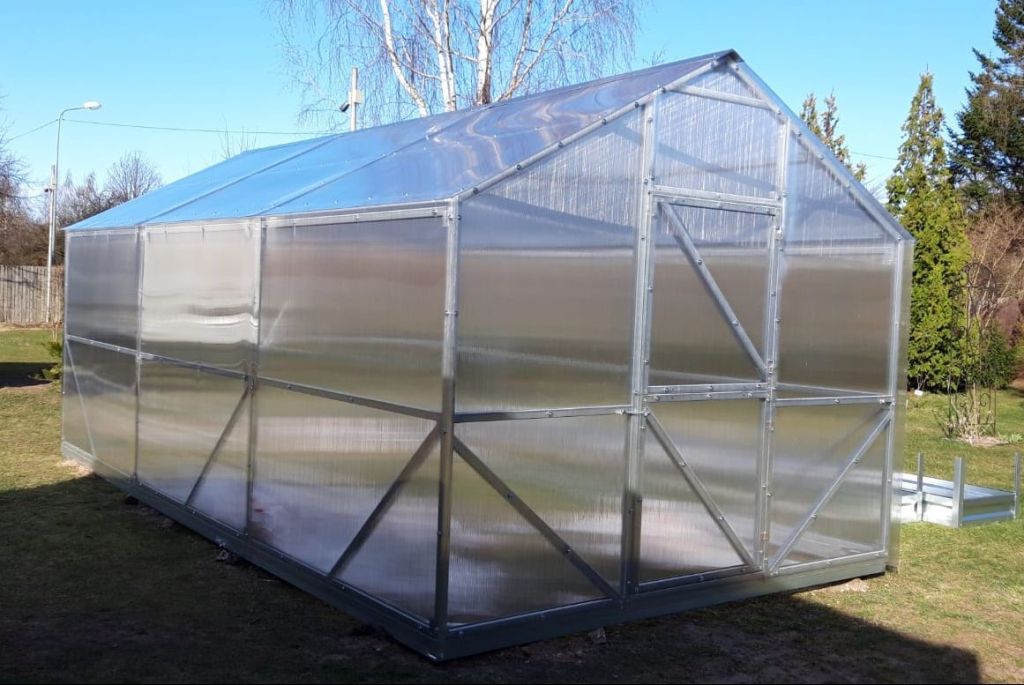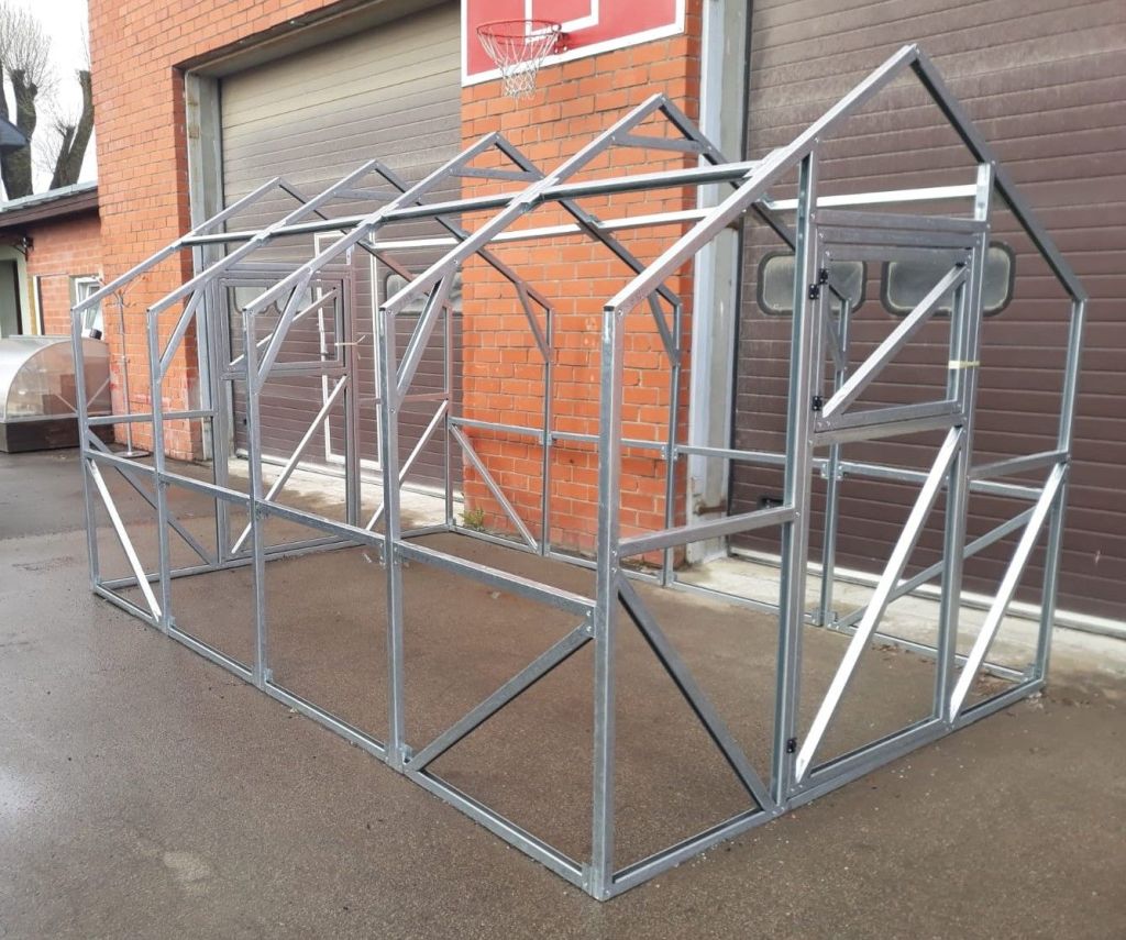 Из оцинкованного квадратного профиля Дверь на обоих концах с окном для проветривания. Поликарбонат 4мм. предлагаем так же с Поликарбонатом 6мм 850г/м2 У теплицы с покрытием 6мм торцы выполнены из 4мм поликарбоната В комплекте все необходимые для сборки болты и саморезы