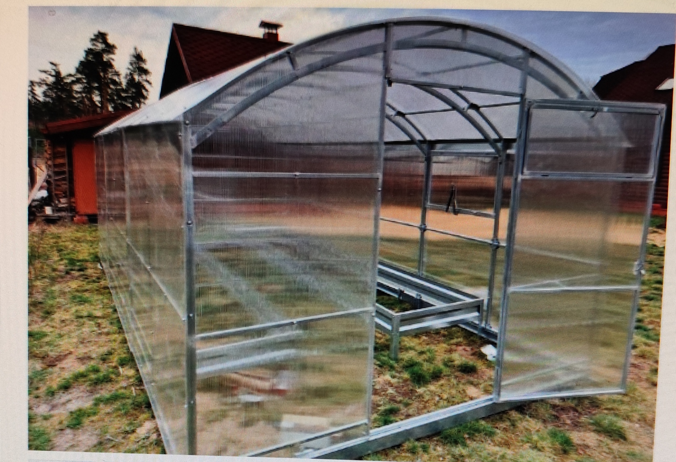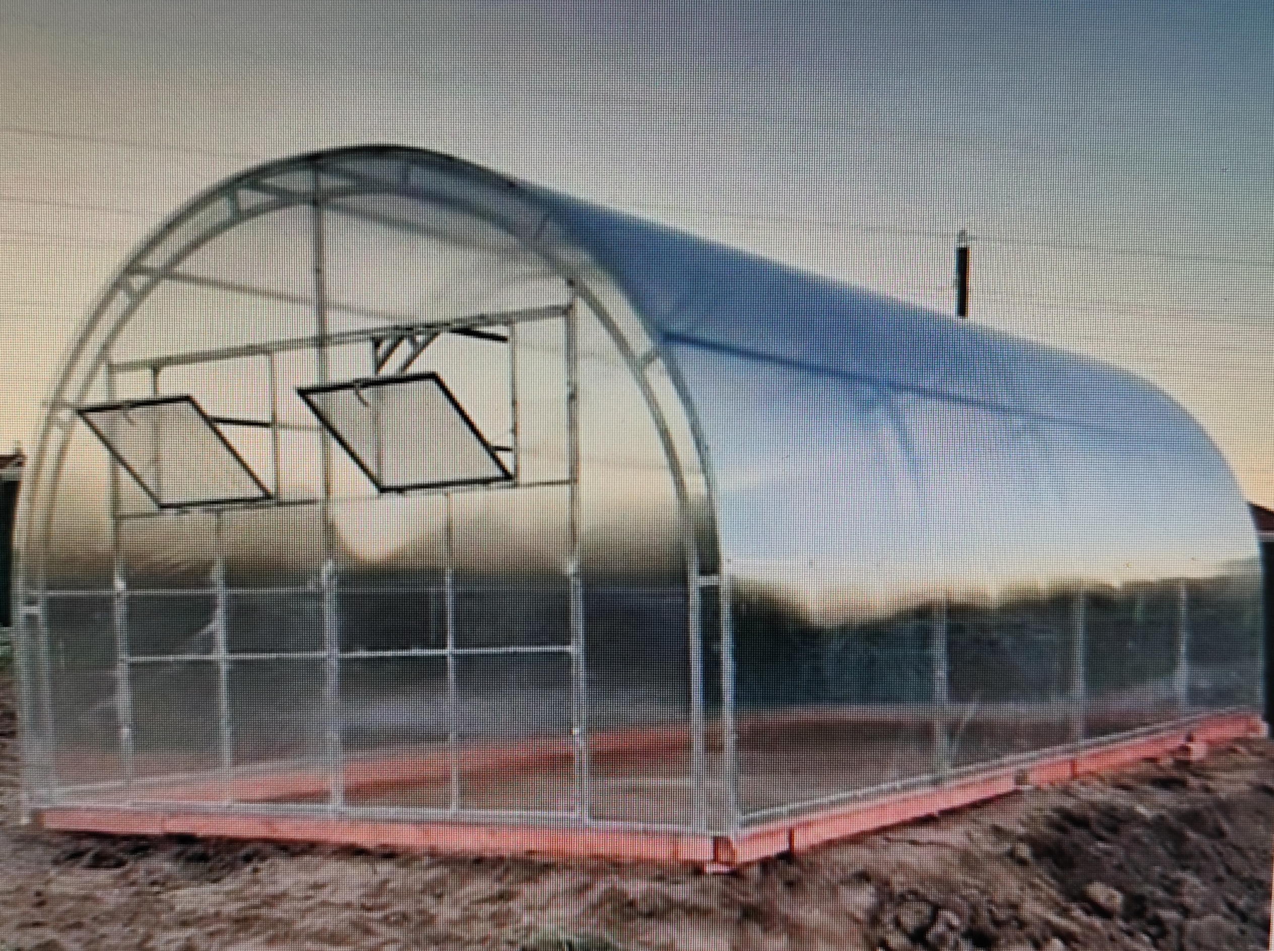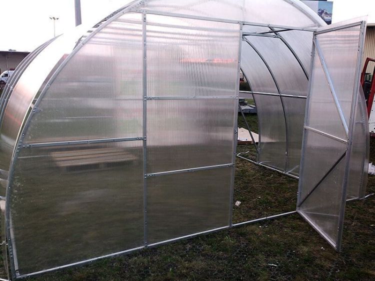 Арочная рама из оцинкованных стальных квадратных труб/ Торцевые стенки- сварные; арки не разборные. Дверь на обоих концах с окном для проветривания, поликарбонат 4мм.